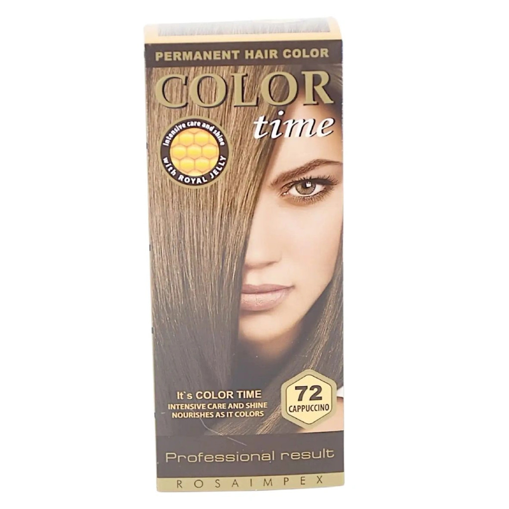 Color Time hajfesték tartós hajfesték méhpempővel. A méhpempő regenerálja, hidratálja és vitalizálja a hajat, csillogást és intenzív ápolást nyújt. A Color Time gél formula hihetetlen színállóságot biztosít. Szín pigmentek a zselével kombinálva mélyen behatolnak a haj belsejébe ezáltal garantálják az élénk színt. A Color Time egy speciális szilikon kondicionálót is tartalmaz ezáltal a haj ragyogó és puha lesz.